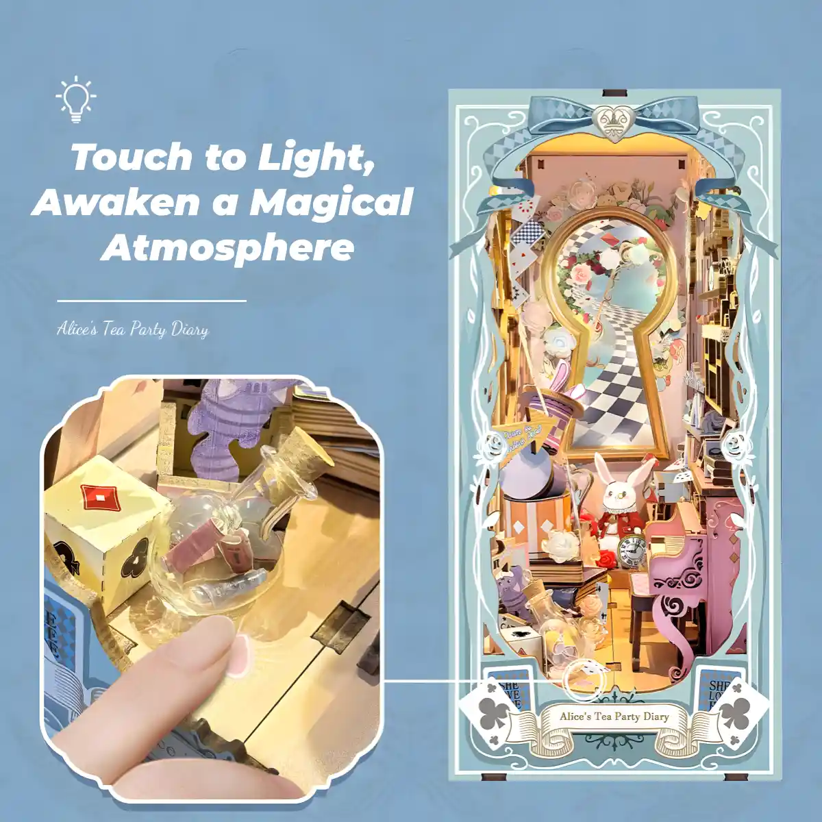 A standout feature of this kit is its touch-activated lighting. It creates a warm glow that recalls the tranquil atmosphere of Alice’s room. With just a simple touch, the scene comes to life. As a result, it evokes warmth, wonder, and a truly immersive experience. Whether displayed as part of your bookshelf or on a desk, this light feature brings a magical touch to any room.
