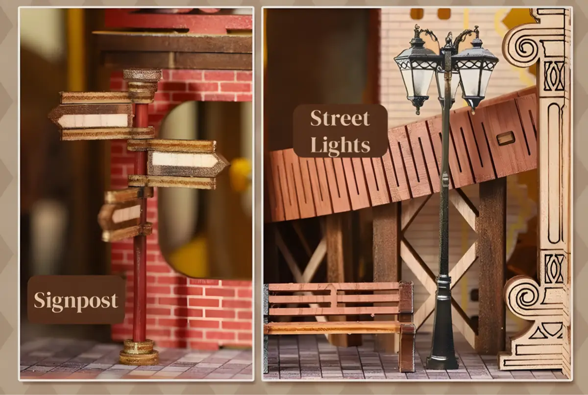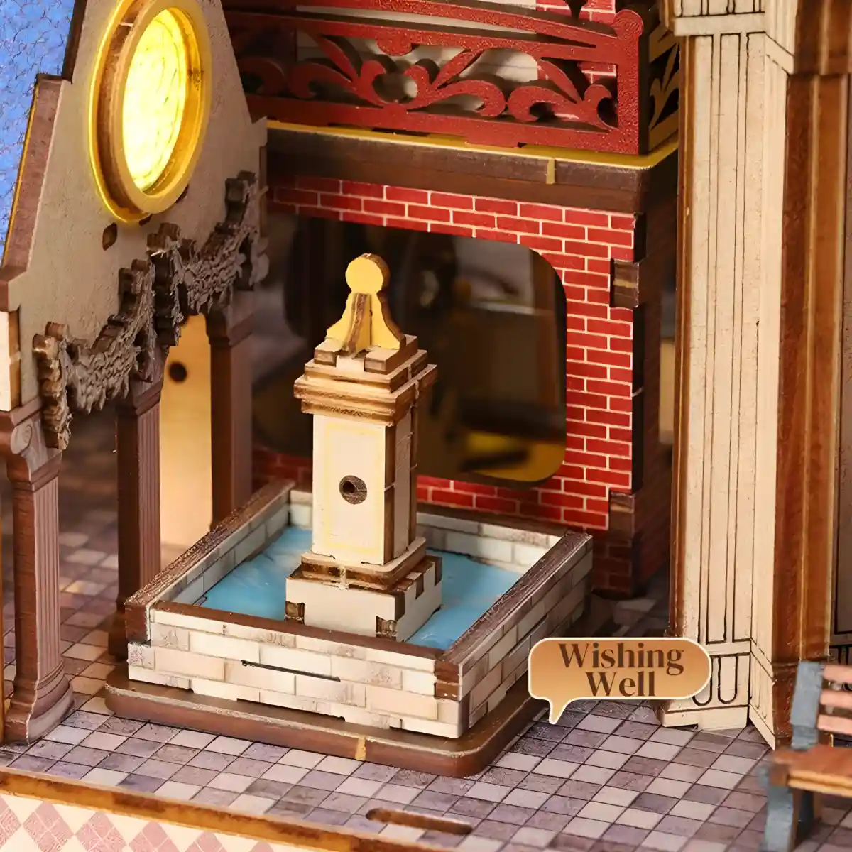 Surrounding the castle is a fairy tale village full of details. A glowing ticket booth marked “TICKET” creates a welcoming entry point. The wishing fountain evokes romance and hope, while tiny figurines and European-style street lamps complete the storybook atmosphere. This puzzle is more than decoration—it’s a miniature fantasy world you build yourself.