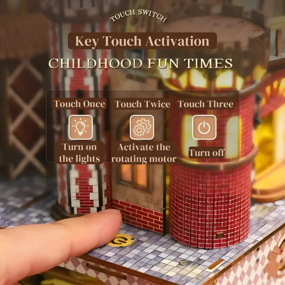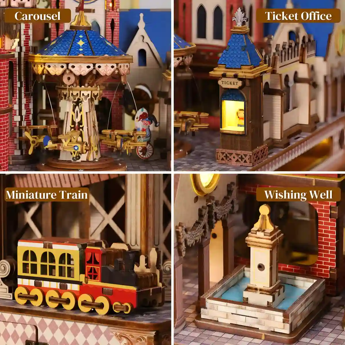 Step into a wonderland of joy with interactive carnival details. The rotating airplane-style carousel, powered by gears and a motor, adds dynamic fun. A whimsical train circles the castle, while circus-inspired figurines—a clown on a unicycle and a bear holding balloons—bring humor and childlike imagination.