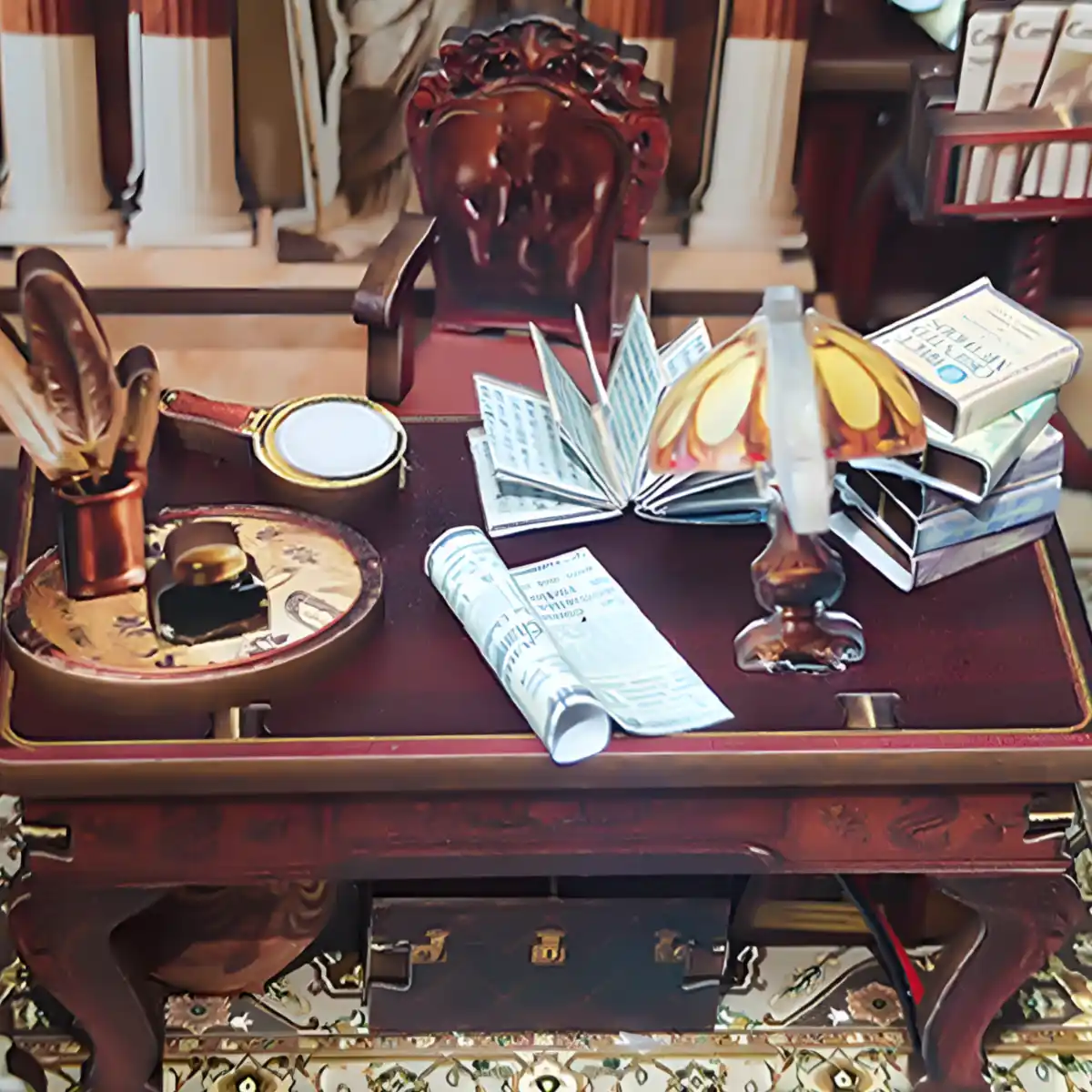 The centerpiece of Athena’s Study Miniature House is her ornate desk. Decorated with ancient scrolls, ink bottles, and a magnifying glass, it portrays the goddess deep in thought. A vintage bookshelf filled with miniature tomes and ancient ornaments adds scholarly charm, while a soft touch-activated lighting system illuminates every detail with golden warmth.