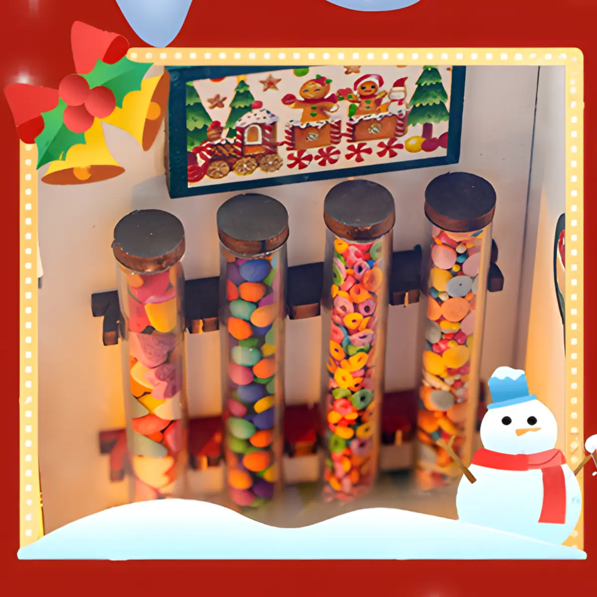 At the heart of the design lies its irresistible candy theme. A swirl-patterned lollipop with a “NEW” tag recalls classic candy-store displays. Rainbow-colored candies sparkle inside clear test tubes. Striped candy canes line the counter, instantly evoking the cozy nostalgia of Christmas mornings. Each colorful detail of the Christmas Candy House Dollhouse brings back sweet memories. It instantly fills your space with joy.