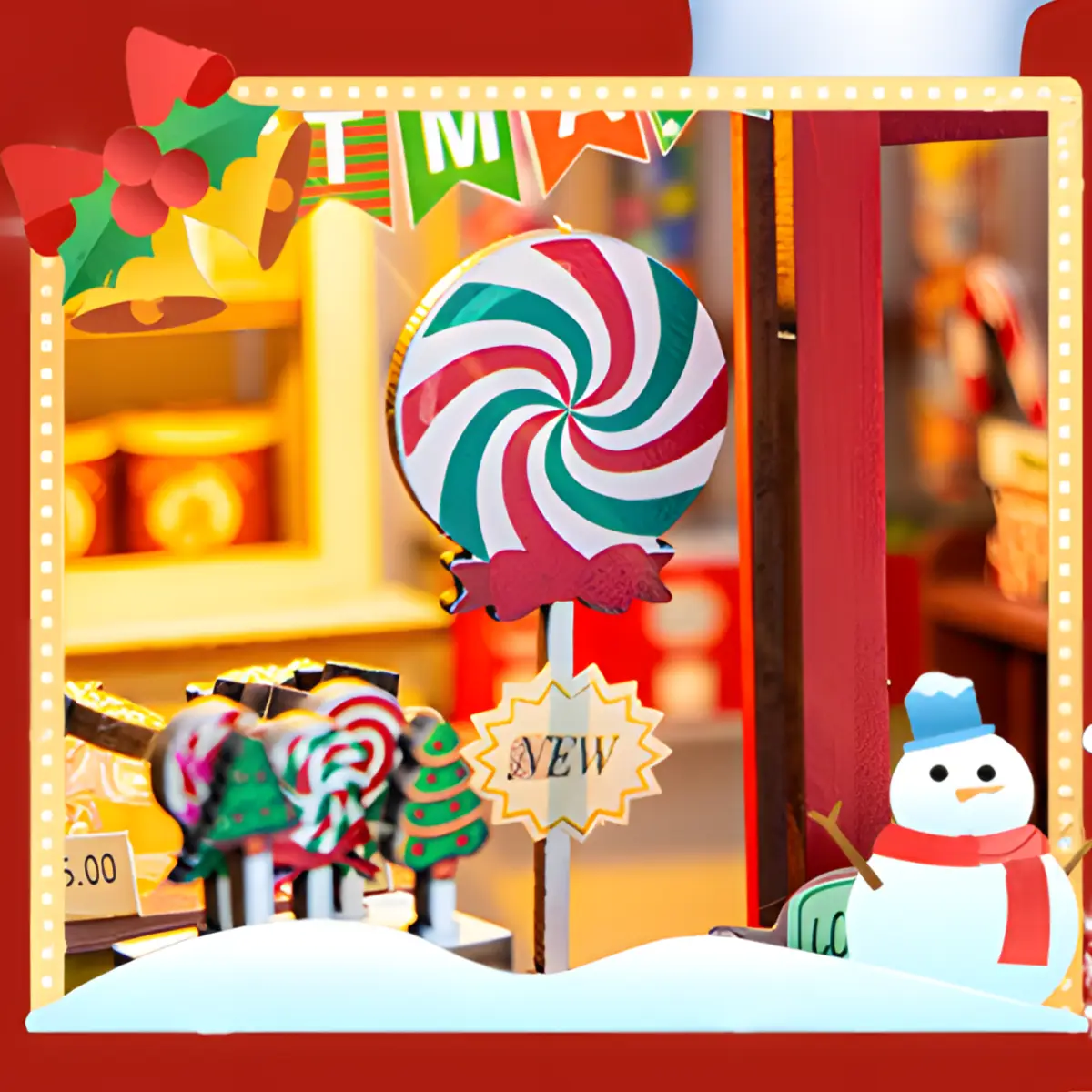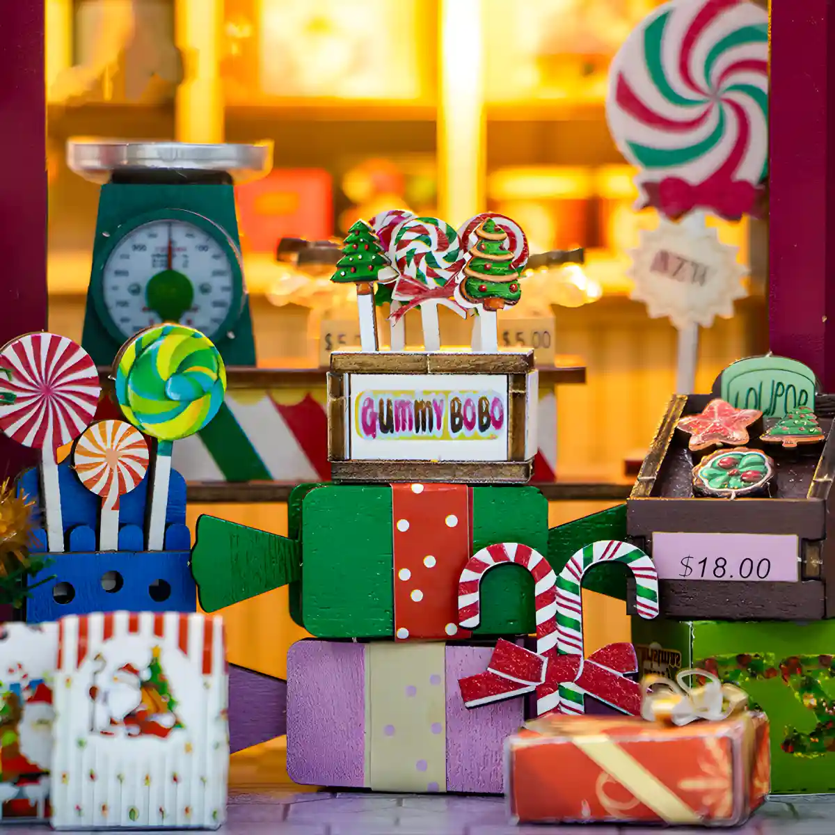 The Candy House Dollhouse features a charming red-and-white striped awning and a nostalgic “Candy House” sign, recreating the look of a vintage candy shop. Gift boxes and a “MERRY CHRISTMAS” banner decorate the shopfront. They reflect the joy and excitement of Christmas time. This lively miniature scene is perfect for your mantel, bookshelf, or any miniature house collection.