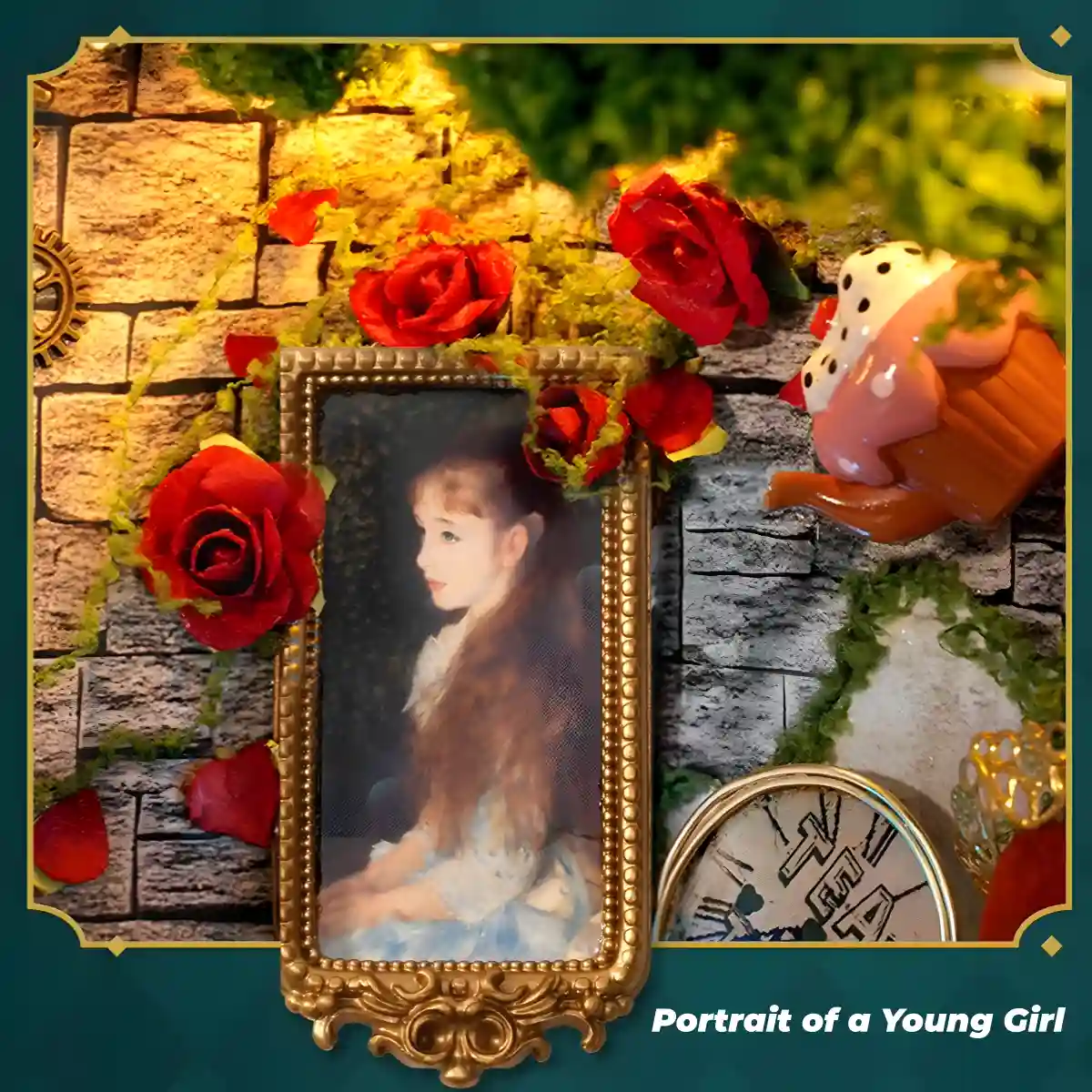 One of the most striking features of the Dream Moment Miniature House is the illuminated portrait. A girl in a blue dress, half-hidden by ivy, appears to step out of her frame as the waterlight glows. The shifting light creates the illusion of motion, enhancing the magical and interactive quality of the kit.