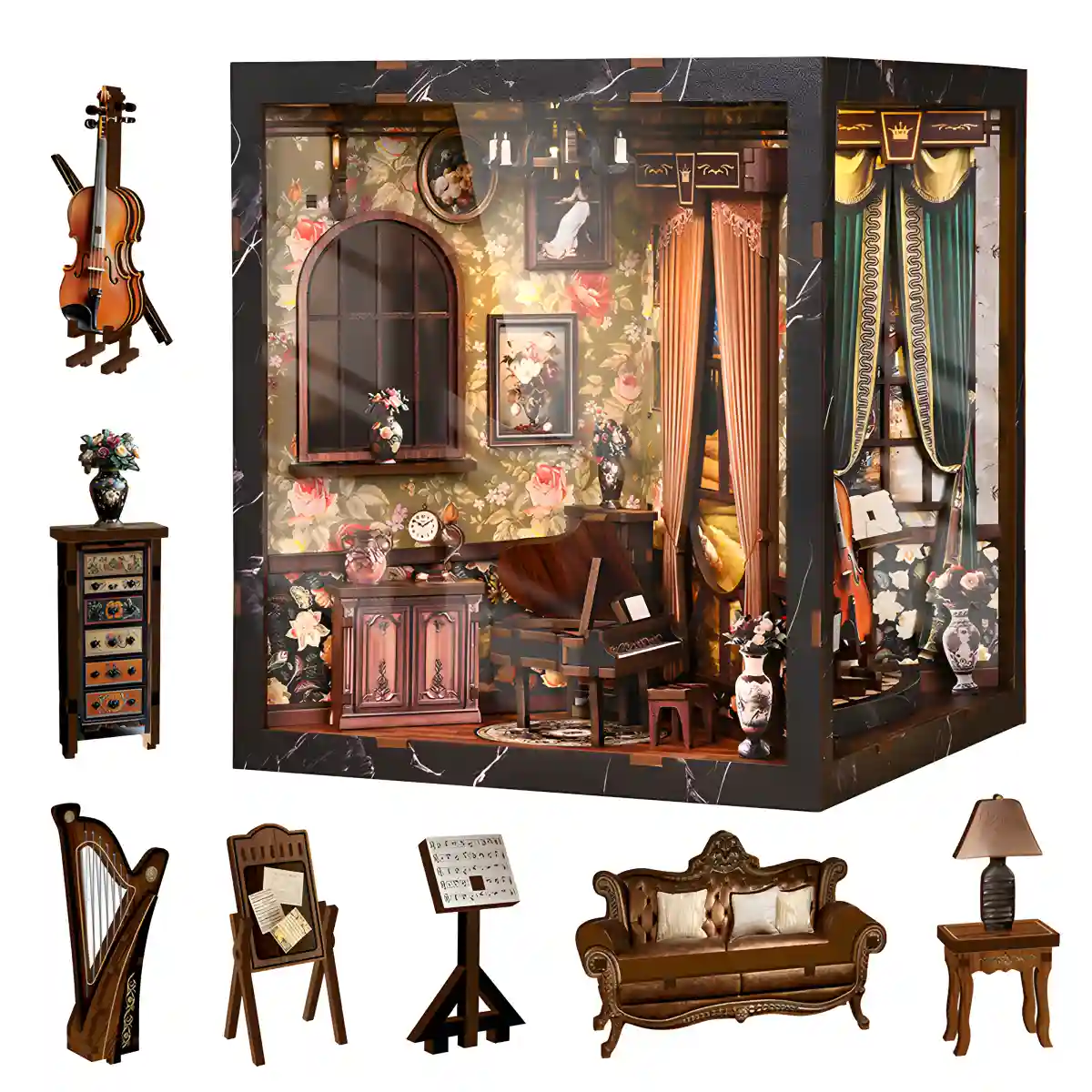 In this scene, a grand piano becomes the heart of creativity. Surrounded by floral decorations and arched windows, it glows under a soft LED light — activated by a gentle touch. Every curve, every key, and every shadow reflects craftsmanship and rhythm, turning your bookshelf into a concert of miniature beauty.
