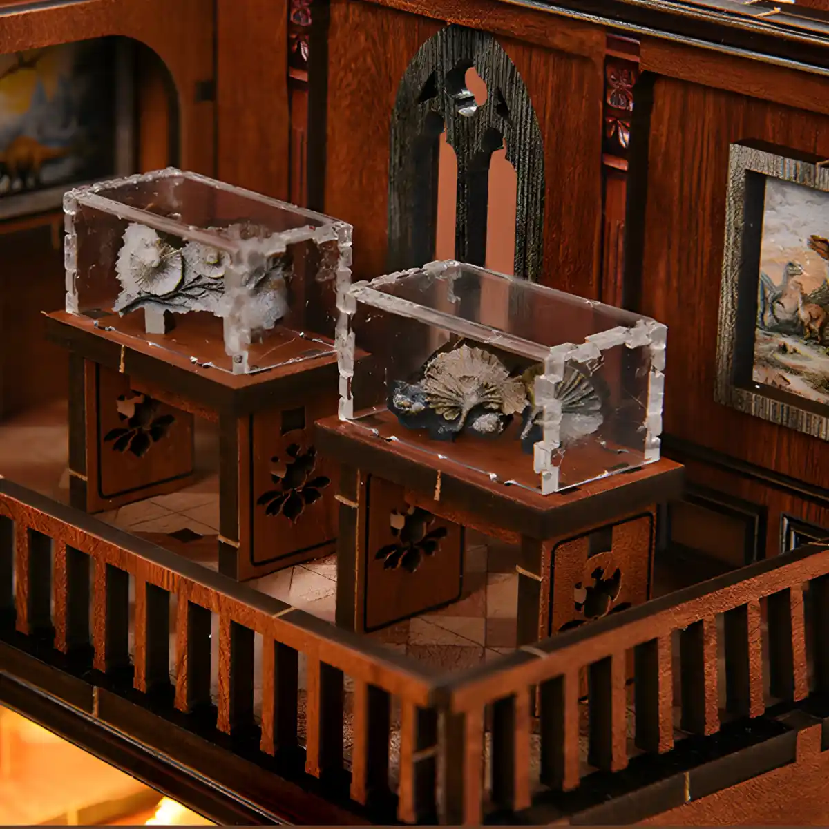 Beyond the exhibits themselves, the Fossil Museum Book Nook Kit tells a deeper story through its environment. Inside the scene, you’ll find a vintage wooden desk, open reference books, and prehistoric-themed wall illustrations depicting ancient ecosystems. These elements suggest the unseen world of research and discovery, where scientists study fossils to reconstruct ancient life.