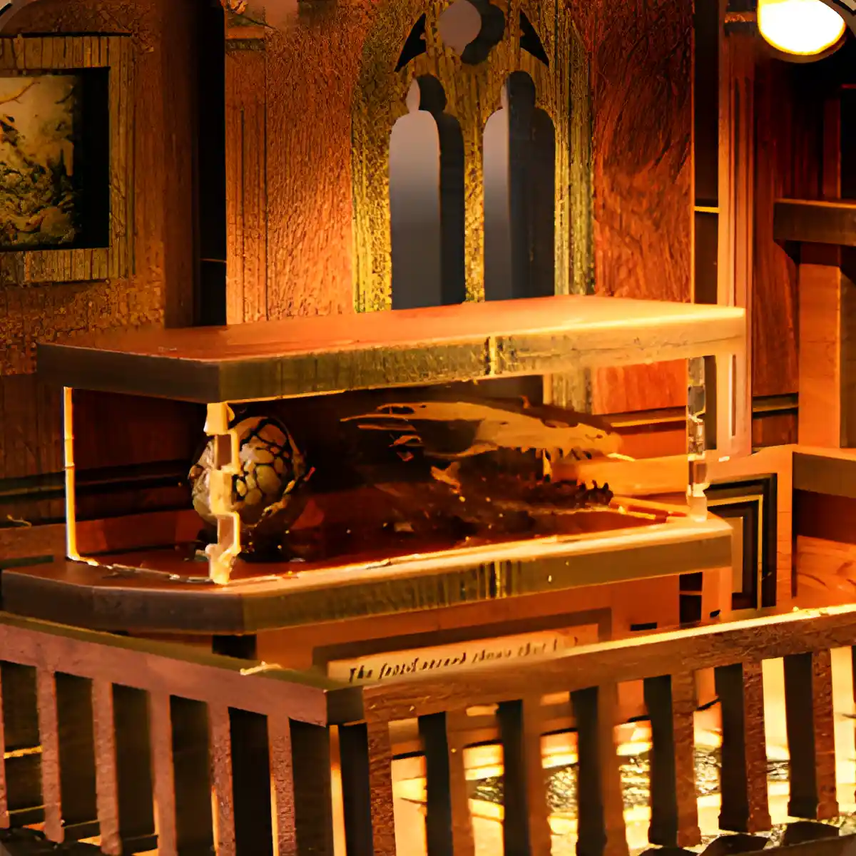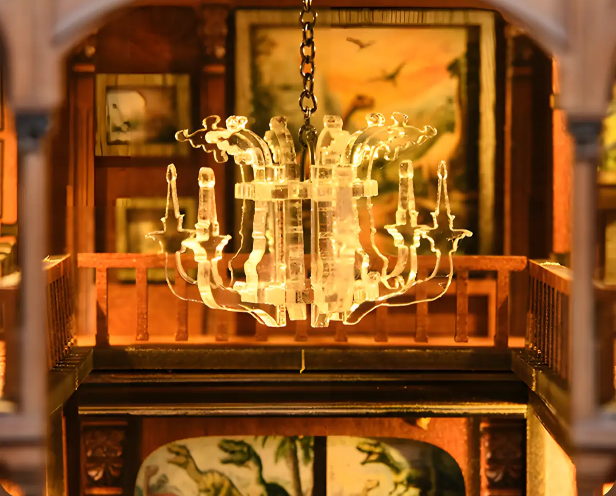 Lighting plays a crucial role in immersion. A crystal-style ceiling lamp with warm LED illumination brings the scene to life, controlled via a touch-sensitive switch. When lit, the Fossil Museum Book Nook Kit glows with a calm, nostalgic ambiance reminiscent of museum halls at closing time, transforming your bookshelf into a quiet place of reflection and wonder.
