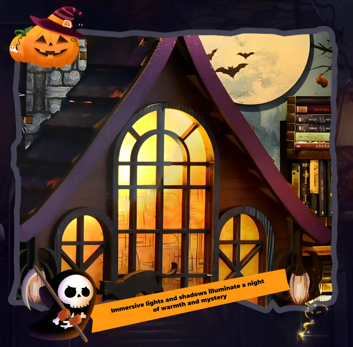 Together, they recreate a whimsical Halloween diorama, where creatures dance, hide, and play in the magical night.