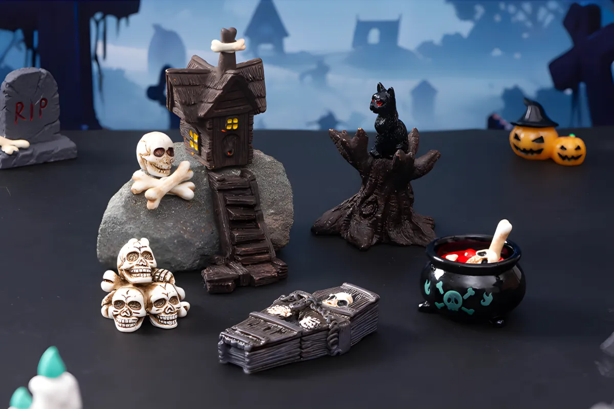 Each figure features intricate craftsmanship to maximize visual impact in micro-landscapes or as standalone Halloween decor items.