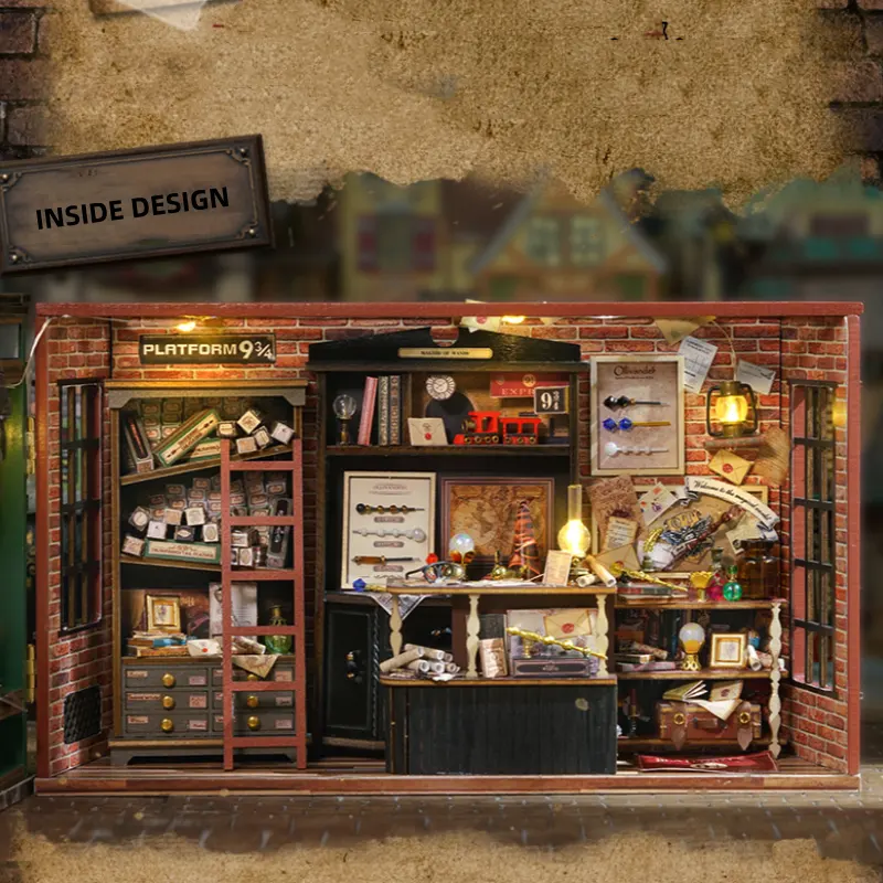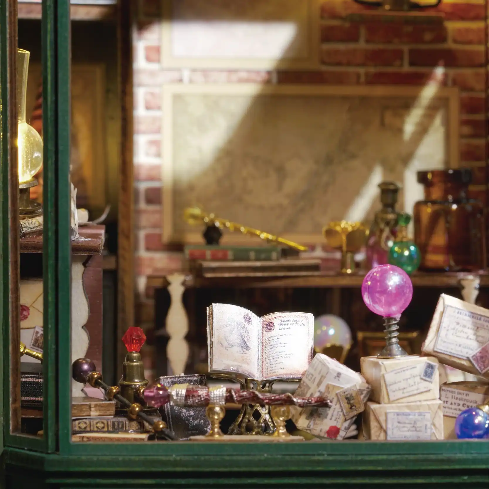 Step into the world of wizardry with the Magic Wand Shop DIY Miniature House by Rofuntime. This fantasy-themed kit is designed for intermediate crafters who love magic and intricate details. Recreate the iconic Ollivanders Wand Shop, complete with an elegant wand cabinet showcasing miniature wand boxes labeled with mystical runes. The shop’s arched windows glow softly, revealing tiny floating spell books suspended by invisible threads — a perfect homage to Harry Potter’s magical Diagon Alley.