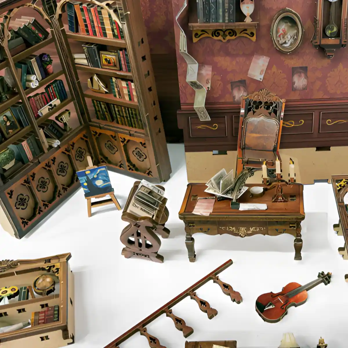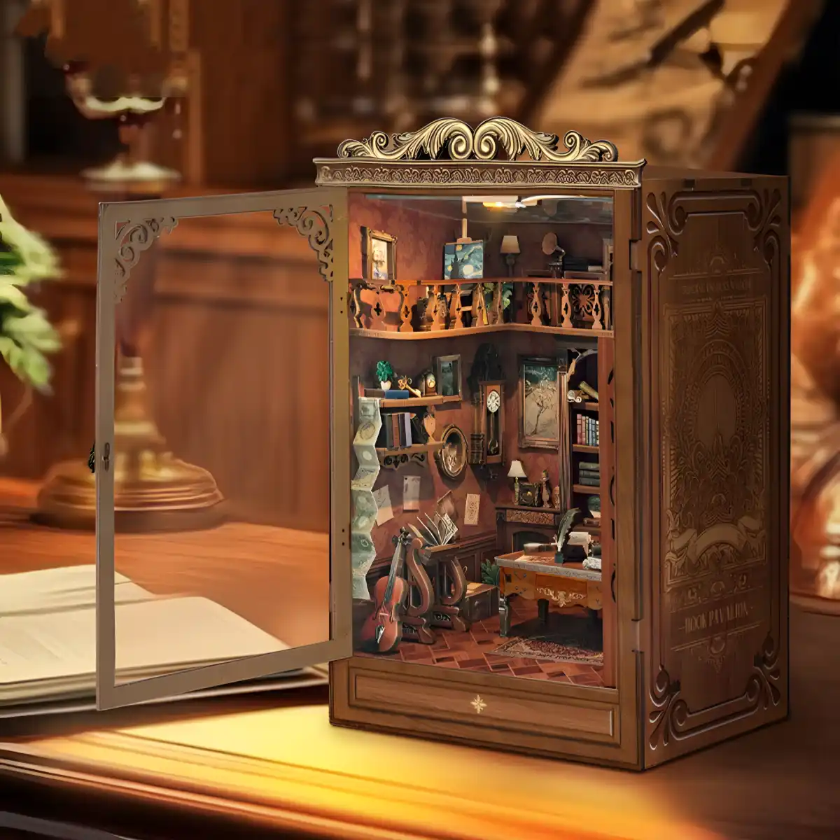 Every corner of the Time Book House DIY Book Nook Kit whispers art and emotion. A violin leans gently against the wall, as though pausing mid-song. A palace-style clock anchors the scene with its ornate charm, while oil paintings and sculptures add depth and culture. Together, these elements form a world where knowledge meets art, inviting you to step into a poetic conversation between time and creativity.